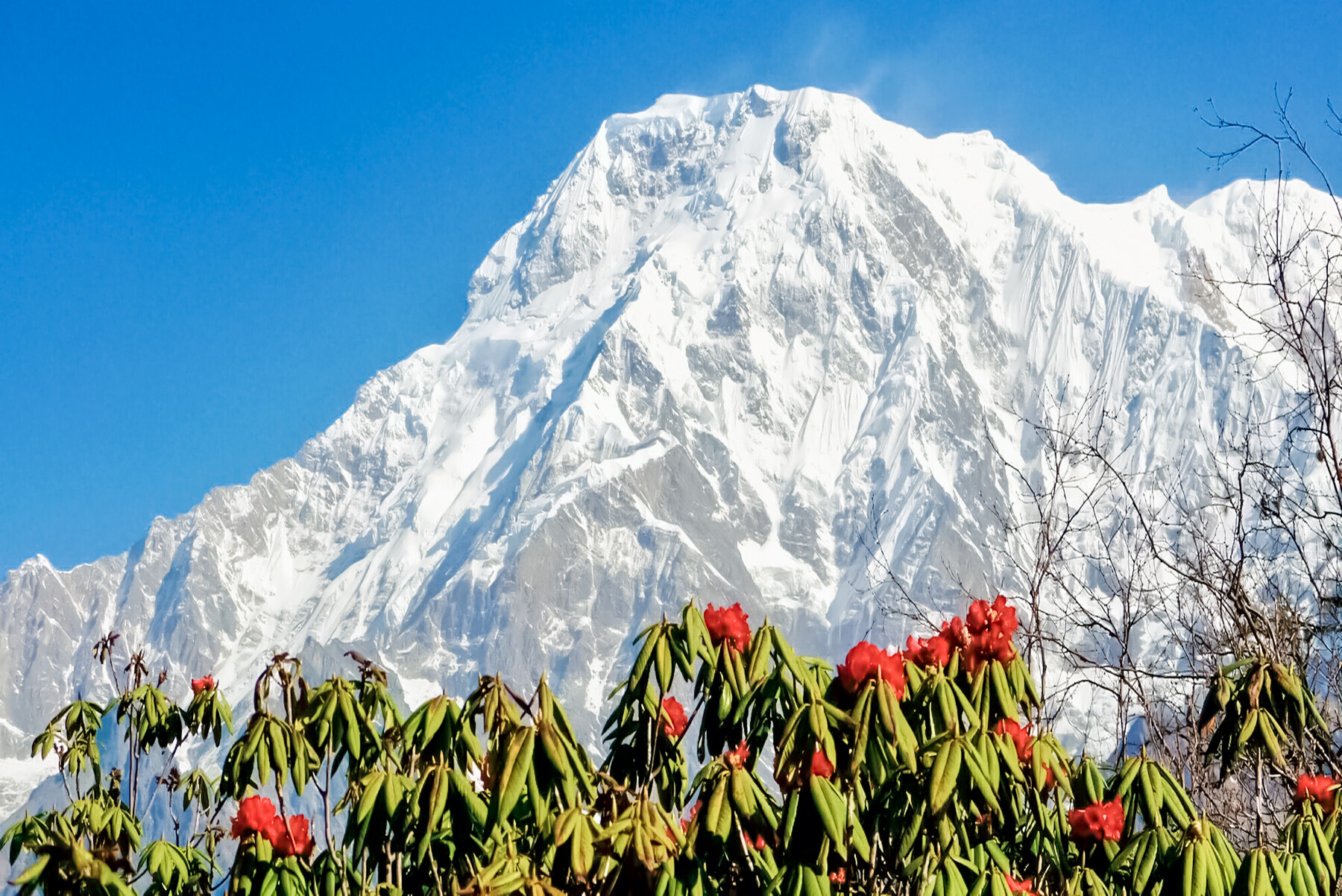 Тропа стартует с каменистого подъема через цветущие рододендроновые заросли. На отметке 3 200 м — выход к обзорной площадке с первым видом на Ламджунг Химал (6 983 м) и отроги Аннапурны, пик Писанг (6 100 м).
