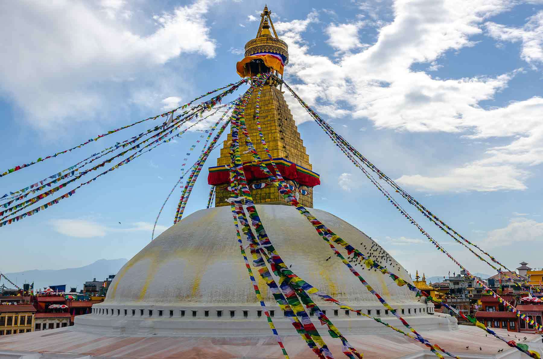 Переезжаем в район ступы Боднатх - основной центр тибетского буддизма в Непале. Ступа поражает своими размерами, построена в VI веке, через Боднатх лежал путь из Тибета в Индию, и здесь останавливались многие известные паломники.