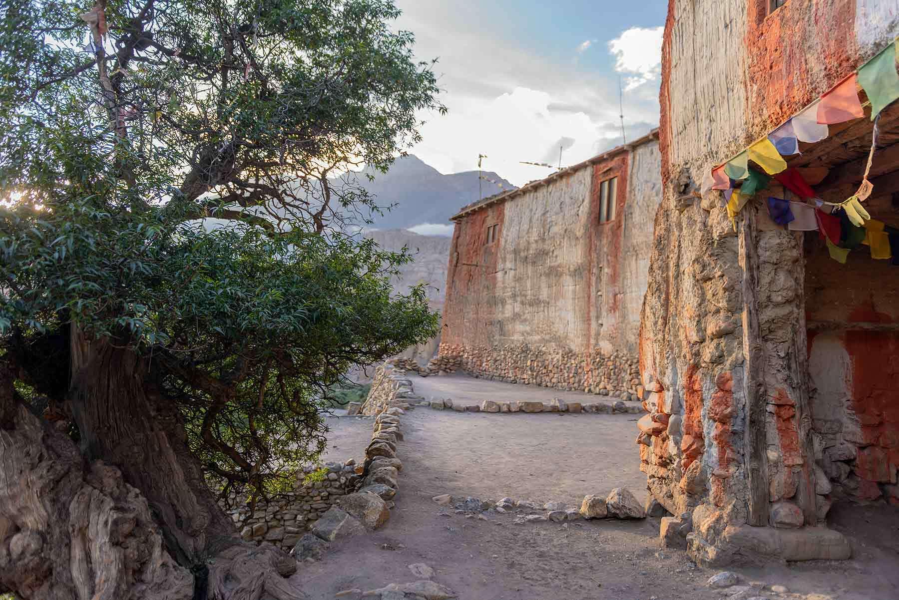 Мы отказываемся от стандартного пути в Джомсом, наш маршрут сворачивает к деревне Лупра, спрятанной в ущелье Панда Кхола. Это место — капсула времени: каменные дома с резными ставнями, поля ячменя и жители, сохранившие древнюю шаманскую традицию Бон. В монастыре, хранятся тайны древних знаний и ритуалов, а в скалах над деревней зияют пещеры-кельи отшельников, столетия назад искавших просветления в медитациях.