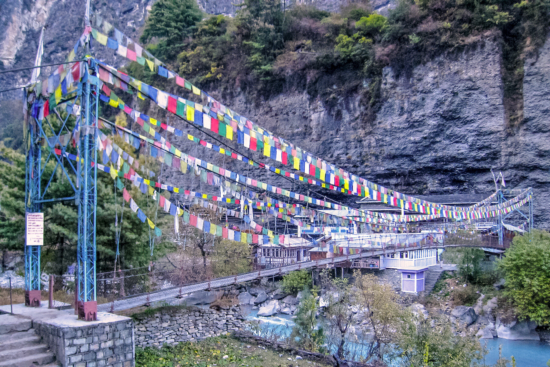 Йогические разминочные практики. Завтрак. Сборы и выход. Сегодня относительно легкий день, нам предстоит пройти всего 15 км по узкому ущелью с отвесными скальными стенами. Тропа петляет вдоль реки Марсиангди, пересекая её по подвесным мостам. При ясной погоде открываются первые виды на восьмитысячник Манаслу (8 163 м) и пик Аннапурны II (7 937 м) в районе Мананага. Периодически мы делаем чайные паузы с панорамами гималайских хребтов.