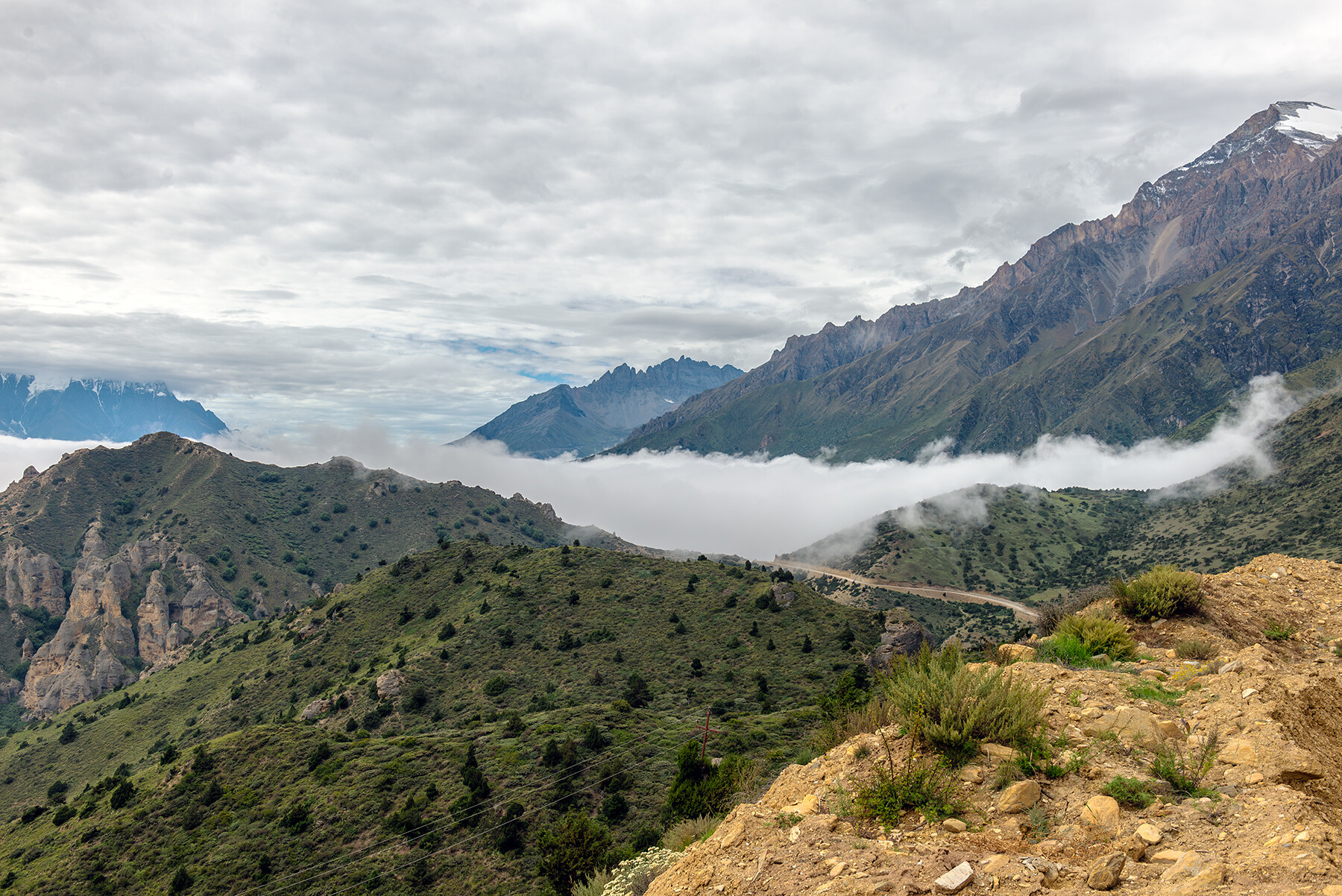 Семь часов в дороге — не просто переезд, а медитация под ритм колес: то тут, то там мелькают разноцветные флажки, деревушки, затерянные в зелени, и реки, бурлящие в ущельях. Обед в дороге.